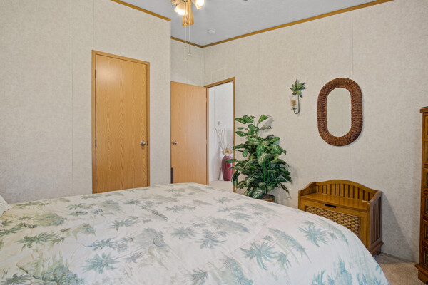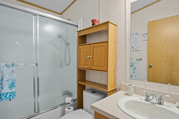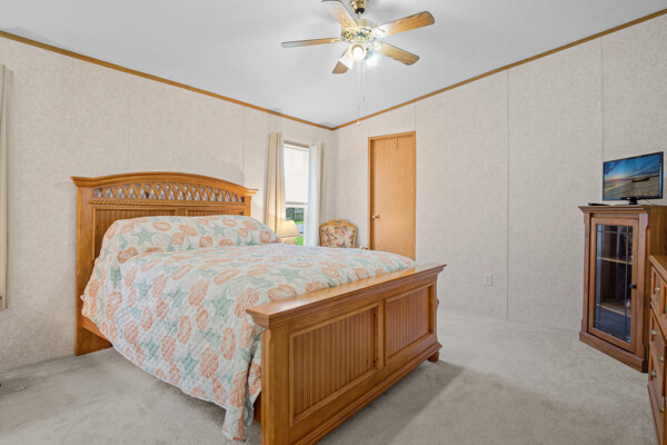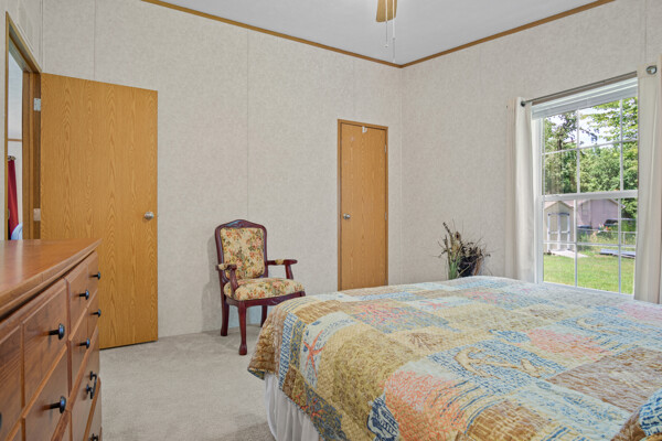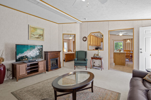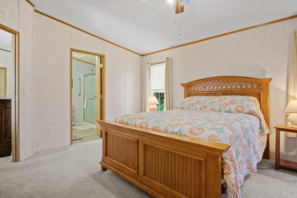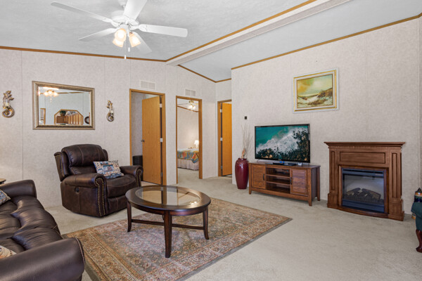 Inside, the primary bedroom is a true retreat, featuring a walk-in closet and an ensuite bathroom with a newly installed shower. The vaulted ceilings and electric fireplace add an open and cozy ambiance to the living area, perfect for chilly evenings.